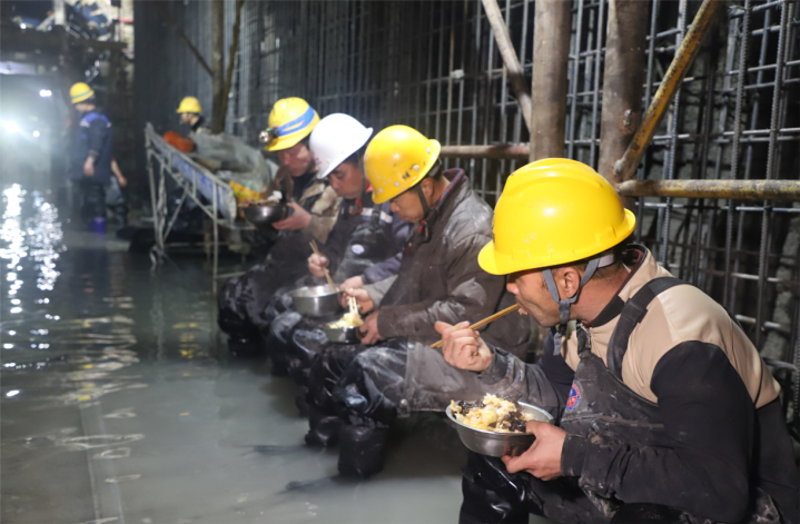齐志图还特意嘱咐厨师给工人们加几道菜,一定让大家吃好,在工地上也要把年过好。平日里,为了保工期,隧洞工程24小时不停歇,洞内的工人实行昼夜倒班制度,大家蹲在一起吃冷饭是隧道内最常见的场景,也正是靠着这样的毅力,他们啃下了项目施工中一块块“硬骨头”。一顿美味的年夜饭,是对齐志图和与他一同并肩作战的兄弟们最好的慰藉。